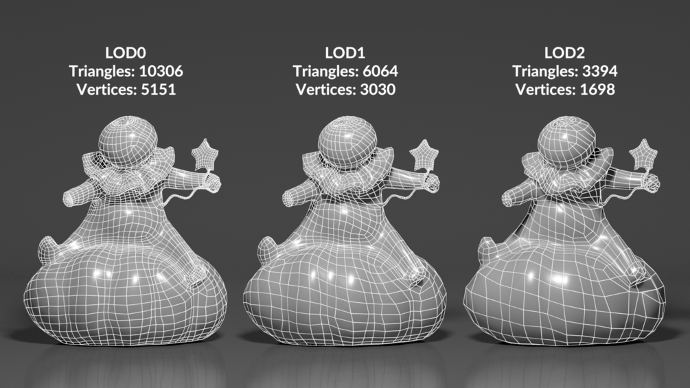 - One model divided into 3 LOD levels; level 0, 1, and 2.
