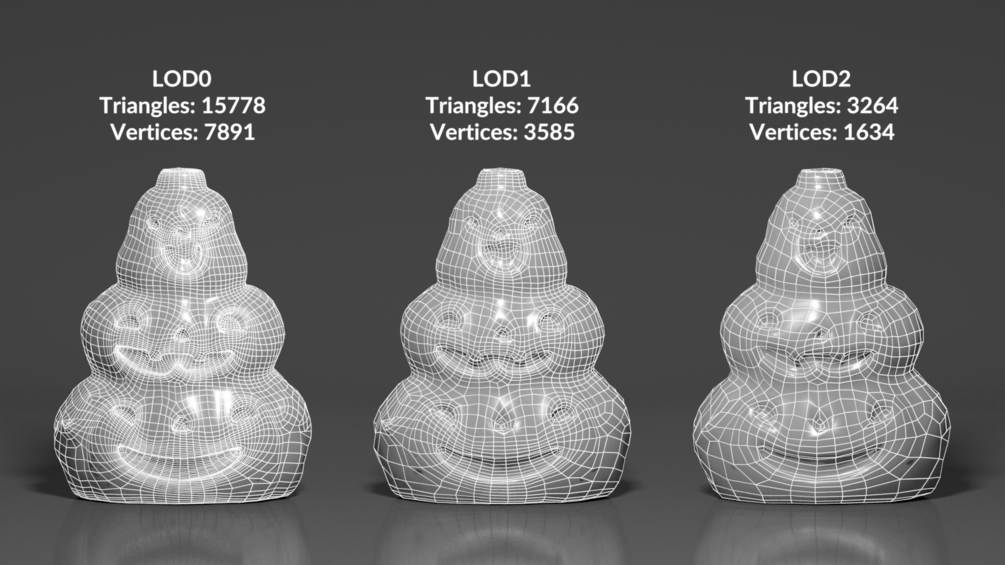 - One model divided into 3 LOD levels; level 0, 1, and 2.